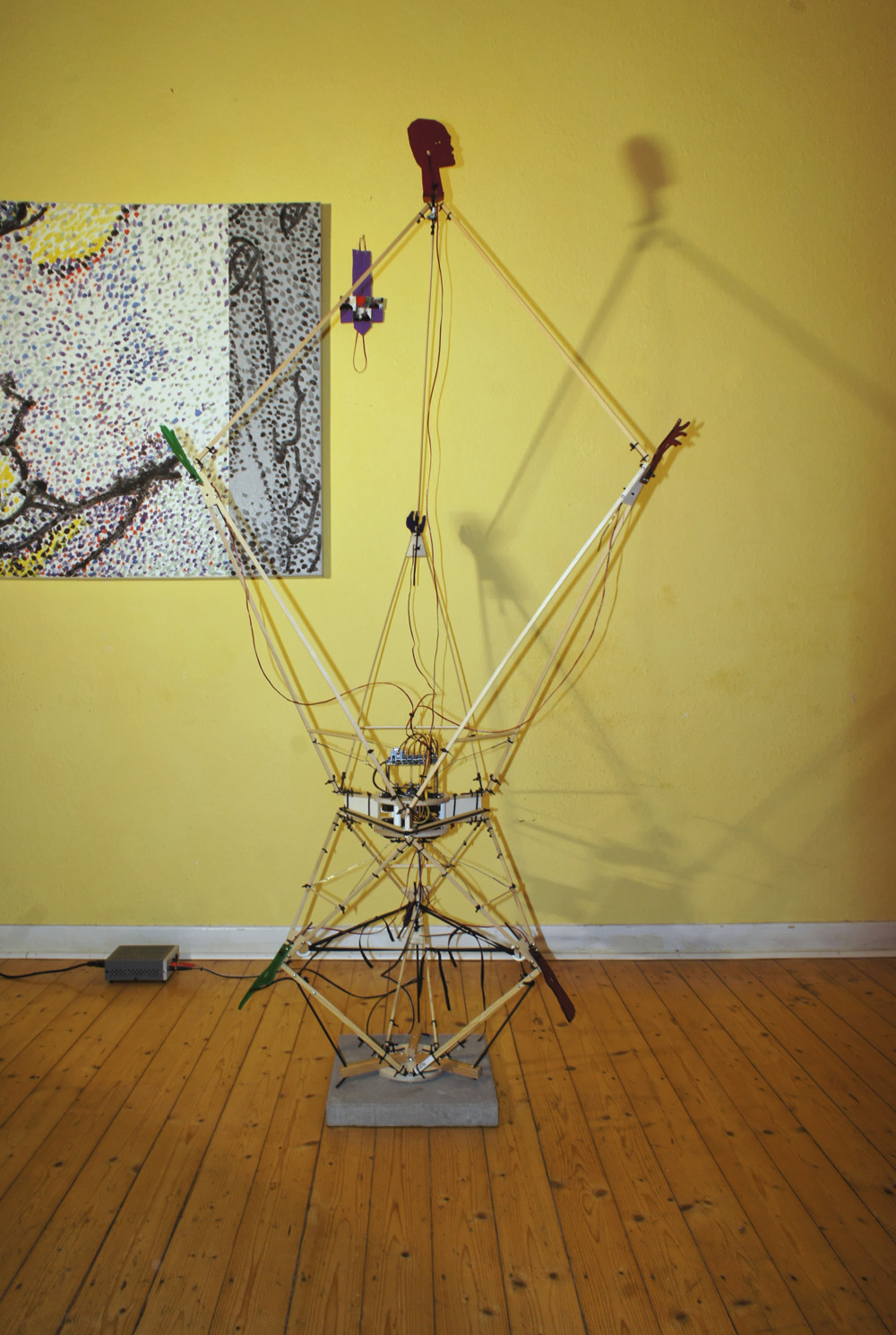 Aufbau und Struktur von Raumformer_01:    Das Skelett von Raumformer_01 besteht aus Holzstangen, die ungefähr die Form von zwei gestapelten Doppelteträdern bilden. Der untere der beiden ist ungefähr halb so groß wie der obere und dazwischen befindet sich eine Ebene, auf der die sechs Servomotoren und die Steuerung montiert ist. Als Standfuß dient eine Betonplatte und an den äußersten Ecken sind Acrylglasteile angebracht, die die Form von Händen, Füßen und ganz oben eines Kopfes haben. Diese symbolisieren einerseits den Tanz des Raumes und machen andererseits die Bewegung noch deutlicher da das Auge sich an ihnen orientieren kann.