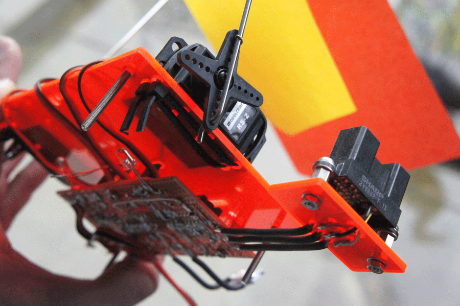 Idee : Die Interaktion mit dem Erleber sowie das Spiel der sich wandelnden Gestalt sind Thema dieser kleinen Wandinstallation. Zwei Servomotoren bewegen farbiges Seidenpapier zeitversetzt hoch und runter. Es entsteht ein Spiel der Farbflächen. Eine Hinterleuchtung des transluzenten Papiers verstärkt die Wirkung und fokussiert den Blick auf das Wechselspiel der Farben. Über einen Sensor kann der Erleber Lichtstärke und Geschwindigkeit beeinflussen, so das er Teil der Installation wird.