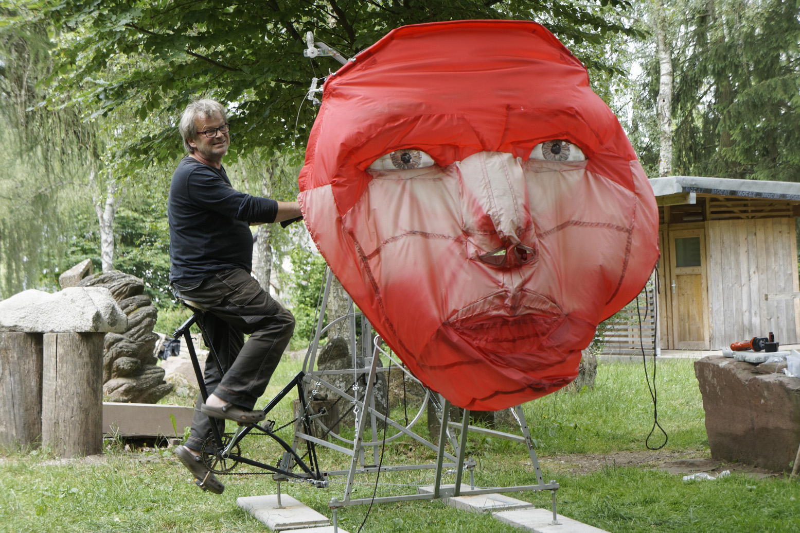 Material: Textile Gesichtsmaske, Stahl, Alu, Acrylglas, Betonplatten und Verbindungsmittel