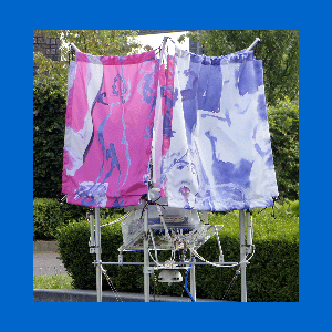 Form und Funktion:    Die Installation "Inkokitasesi" steht auf 4 Füßen, bestehend aus einer Bodenplatte und 4 Alurohren, die senkrecht aus der Platte nach oben ragen. Auf den Rohren ist eine innere Konstruktion befestigt, an welcher wiederum 4 bedruckte, quadratische Textilien befestigt sind und zwar so, dass sie die Seitenflächen eines Würfels bilden. Auf dem Würfel sind digital bearbeitete Tintenaquarelle zu sehen mit Motiven von Menschen beziehungsweise von Gesichtern oder deren Sinnesorganen.
