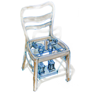 Zwei Zinnhände öffnen sich nach oben, aus der fehlenden Sitzfläche eines alten Stuhles herausragend. Zwischen ihnen ragt ein Holzrund eines abgeschnittenen Besenstiels senkrecht heraus. Unter den Händen befinden sich zwei Pneumatikzylinder die die Hände auf- und ab bewegen. Nur wer noch jung und unschuldig oder sehr naiv ist, hat wohl den reinen, freien, unverdorbenen Blick auf dieses Objekt. Jeder andere kann sich wohl kaum von seinen Sexfantasien frei machen, welche durch die Luftgeräusche der Zylinder noch untermalt werden.