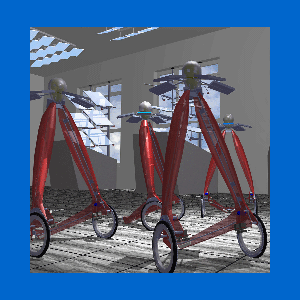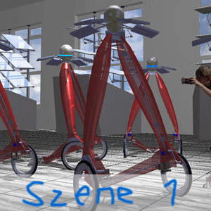Aufbau, Funktion :    Wie oben schon beschrieben besteht die Installation "Hunger" aus mehreren (min drei) autonom bewegten Lichtverspeisern, die sich in einem Raum frei bewegen, um die beste Position unter dem im Raum wandernden Lichtkegel zu bekommen. Nur dort erhalten sie genug Energie, um ihre Funktion aufrecht zu erhalten. Jeder Lichtverspeiser führt auf zwei angetriebenen großen Rädern und einem kleinem Stützrad. Seine Form ist der von Kopffüßlern nicht unähnlich. Ein von Solarzellen kreisförmig umgebener Kopf wird von zwei beinförmigen Stützelementen getragen. Unten an den Stützelementen befindet sich jeweils links und rechts die Antriebsr�der. Hinten über zwei Streben gehalten befindet sich das Stützrad, das die Konstruktion im Gleichgewicht hält. über die Solarzellen werden die Lichtverspeiser mit Energie versorgt, gleichzeitig werden sie aber auch mit den Solarzellen gesteuert. Diese sind so angeordnet, dass sie nur dann alle gleichviel Strom liefern wenn der Lichtverspeiser unmittelbar unter der Lichtquelle steht. Andernfalls kann ein Lichtverspeiser durch das unterschiedlich einfallende Licht seine Position zu diesem ermitteln und bewegt sich in die Richtung zum Licht. über Sensoren werden Zusammenstöße vermieden und eine Interaktion mit der Umgebung erzielt. Vielfältige Interaktionen entstehen aus einem in seinen Grundzügen einfachen Aufbau.