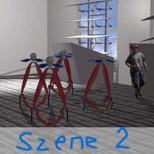 Idee :    Die Rauminstallation "Hunger" besteht aus mehreren autonom bewegten Lichtverspeisern und einer unter der Decke angebrachten Lichtinstallation. Die Lichtinstallation sorgt für im Raum wechselnde Lichtverhältnisse, wobei ein enger, durch den Raum wandernder Bereich intensiv beleuchtet wird. Hungrig nach diesem Licht folgen die Lichtverspeiser ihrer Energiequelle. Ohne diese Energie sind die Lichtverspeiser nur unbewegte Gestalten. Sie müssen warten, bis zufällig auf sie fallendes helles Licht ihnen wider Leben einhaucht. Im Ganzen entsteht eine Jagd nach den besten Plätzen für Leben. Gegen- und miteinander bewegen sich die Lichtverspeiser durch den Raum, ähnlich wie Lebewesen auf der Suche nach Nahrung.